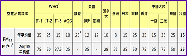 臺灣在2012年5月訂立PM2.5空氣品質標準,24小時平均值應小於35μg/m3,年平均值應小於15μg/m3,希冀到了2020年的年平均目標值在15μg/m3以下。