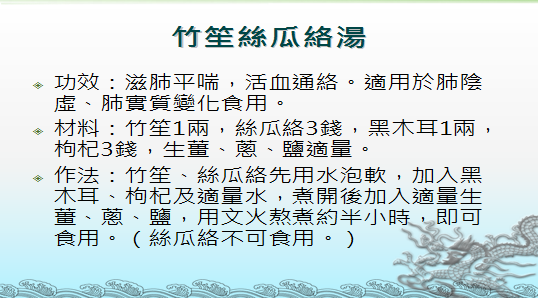 從霾害的中醫病因病機可知,良好的血液循環是避免懸浮粒子進一步損傷人體的要件,除了選擇適當地點加強運動外,活血通絡之品也可幫助肺部血液循環。這裡特別推薦一道食療:竹笙絲瓜絡湯。