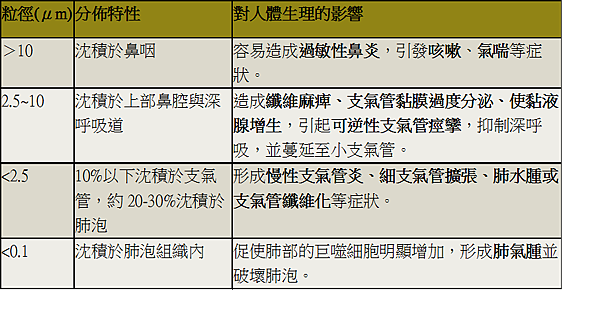 懸浮粒子可經由鼻腔進入呼吸系統,較大懸浮微粒(>10μm)可透過咳嗽及吞嚥、流鼻水等方式去除,細懸浮微粒可攜帶有害化學物質,經由肺泡進入微血管,隨著血液循環至全身。