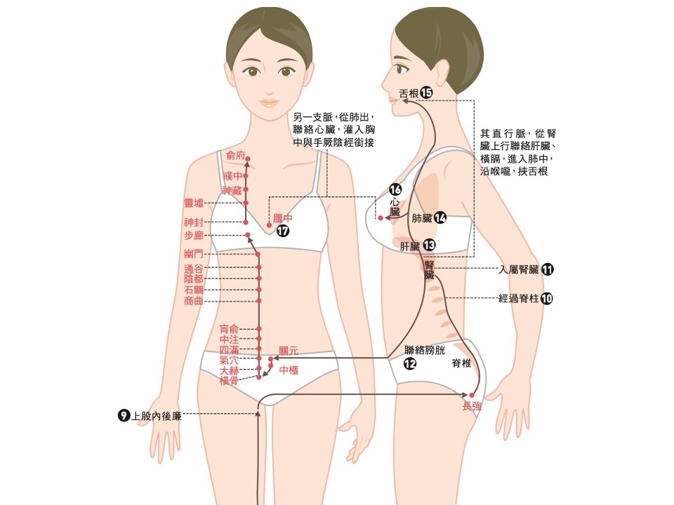 如圖,腎經循行中,其一支脈從肺出來,絡於心,流注於胸中,接手厥陰心包經。圖片出自中醫芳療診察室