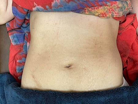這是皮膚癢疹,分佈手、臉、腹部,除了本身的紅疹,也有因為癢而抓出來發紅的情形,紅即為有「熱」。右下有手術痕跡,下方有妊娠紋。腹部兩側皮膚黯沈,可能因發炎日久導致色素沈積,屬於「血瘀」。皮膚大致偏乾,屬於「陰血虧虛」。