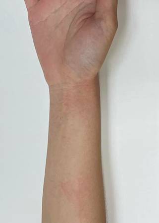 照片中可以看到蕁麻疹呈現顏色非常淡的紅色表示雖然有熱但是熱不盛,膨起、些許透明而不是乳白色表示有濕,是濕鬱於肌膚而作的蕁麻疹。